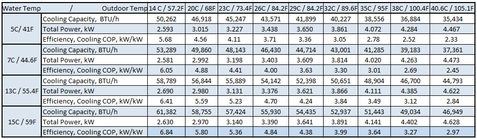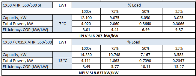 Capacity, IPLV and NPLV certified in accordance with the AHRI Air-Cooled Water-Chilling Packages Certification Program, which is based on AHRI Standard 550/590 (SI) Certified in accordance with the AHRI Air-Cooled Water-Chilling Packages Certification Program, which is based on AHRI Standard 550/590 (I-P) and AHRI Standard 551/591 (SI). Full speed cooling performance map is derived from AHRI certified data, reformatted to include IP values. Heating COP and SCOP is certified by TUV under EN14825 inclusive of EN14511-2, EN14511-3, EN50564. Certain kW/kW values (Si, COP) are converted to EER values (IP, BTUh/W) using the standard conversion factor of 3.412 for convenience.